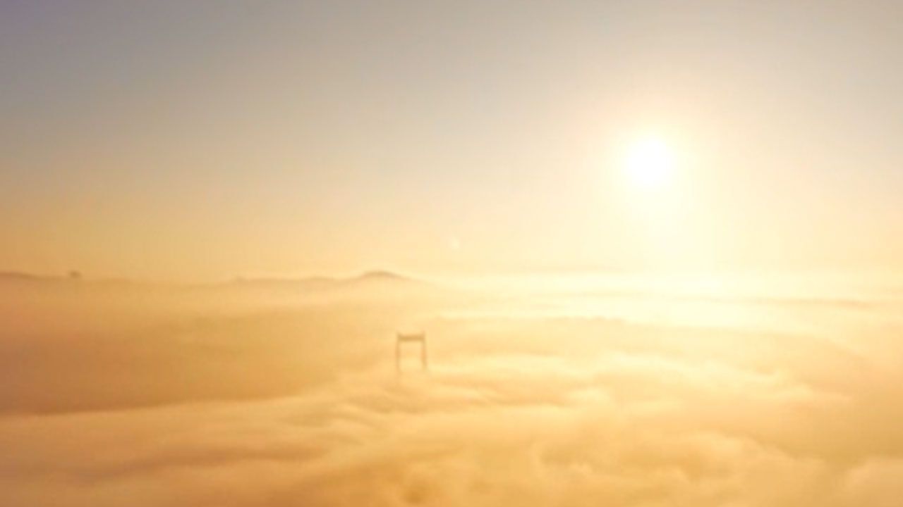 Gün ışığının, megakentin simge yapılarından Fatih Sultan Mehmet Köprüsü ve bulutların üzerine vurduğu anlar havadan görüntülendi. Güneş ışıklarının sis bulutları arasında süzüldüğü anlar izleyenleri hayran bıraktı.